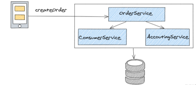 对于单体服务而言,因为方法中的OrderService、ConsumerService、AccoutingService依赖的不同表在同一个数据库中,通过@Transactional(rollbackFor = Exception.class)注解修饰createOrder方法使其成为事务方法,因此不会出现多个事务并发访问导致的数据不一致问题,并且创建订单失败后抛出异常便可以直接使得事务回滚;
