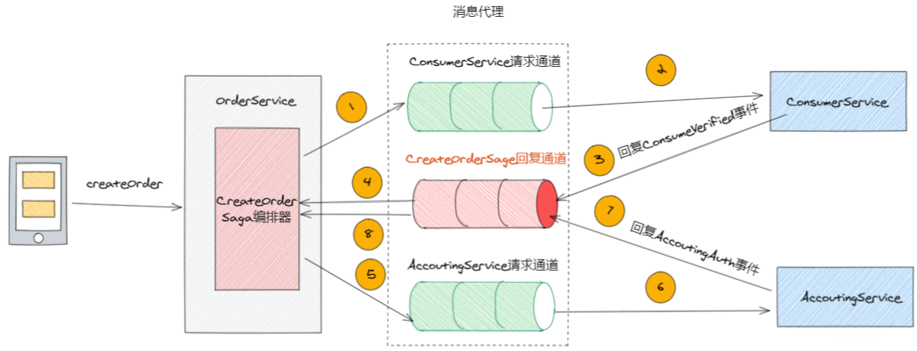 createOrder()方法依赖于ConsumerService与AccoutingService,对应的CreateOrderSaga便会通过消息队列向ConsumerService发送OrderCreated事件,ConsumerService进行处理后会将答复事件信息回复到CreateOrderSaga回复通道中交由Saga进行处理;Saga判断响应结果决定是需要触发回滚or继续向下执行分布式事务,如果响应结果正确则会接着通过消息队列向AccoutingService发送AccoutingAuth事件并等待回复…