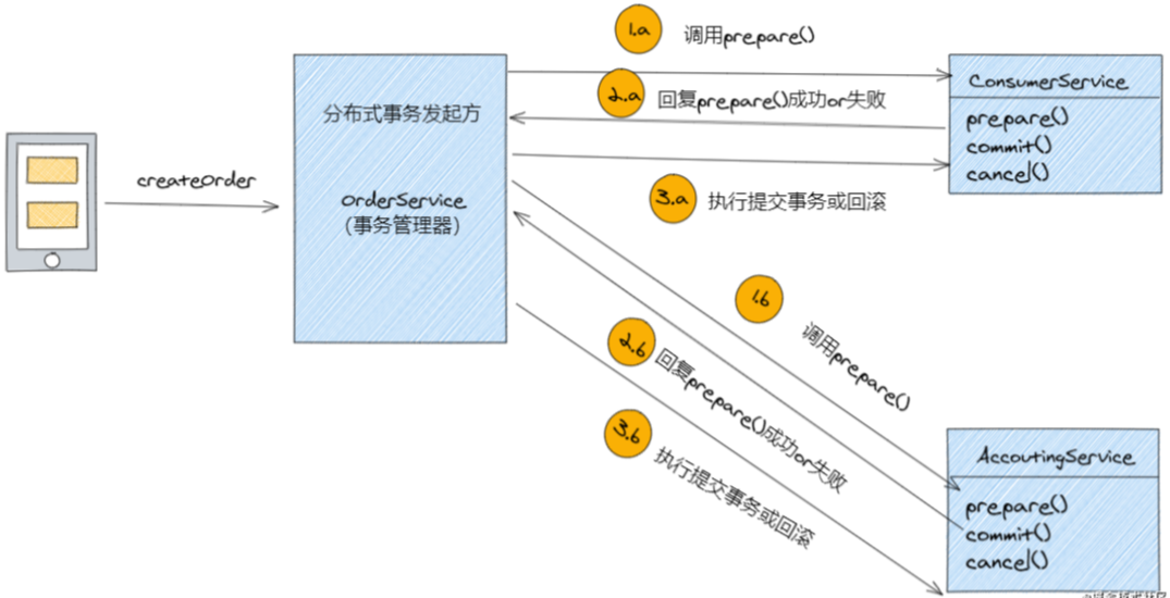 - 第二个阶段-提交阶段:如果所有的参与者返回prepare()方法执行成功,那么事务管理器便会远程调用所有参与者的commit方法进行事务的提交;否则调用cancel()方法进行事务的回滚;
