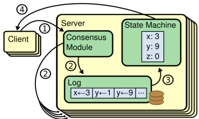 - 复制状态机中的状态一般是指集群节点中数据库的状态,集群节点通过不断接收、应用事件日志使得自身状态与主节点同步;