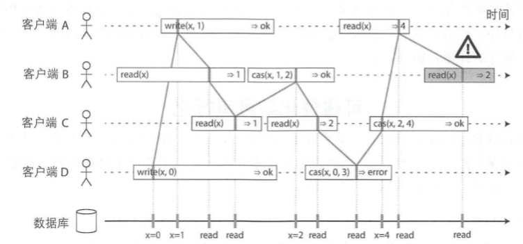 如上图所示:客户端ABCD并发对数据库(存在多个数据副本)进行读写操作,图中矩形的左边表示数据库接收请求的时间,右边表示数据库响应请求的时间,而矩形中的竖线表示请求操作生效的时间;