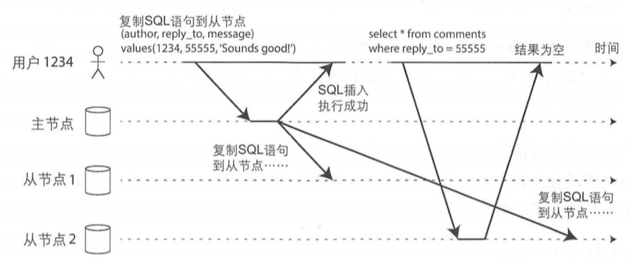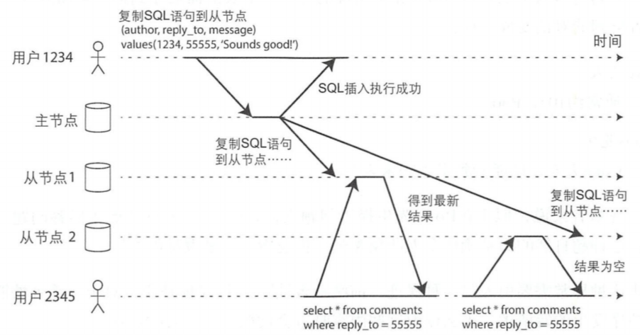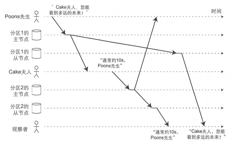 其中提问是回答的因,回答是提问的果,但是下图在分区1中存储因,在分区2中存储果,接着客户端(观察者)分别读取分区1的从节点、分区2的从节点,因为两个分区的主从同步的延迟不一致,当客户端仅按照两个分区上该记录的同步时间用于判断先后时会导致因果关系颠倒;