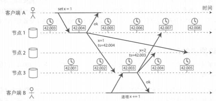 如上图所示,因为节点1的墙上时钟相较节点3快,因而set x = 1的操作全局顺序上应该早于x += 1,但通过各自节点上的时间戳观察时顺序却颠倒了;