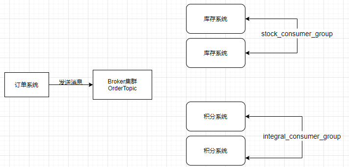 假设我们有一个订单Topic名字是OrderTopic,然后库存系统和积分系统都要消费这个Topic中的数据,我们分别给库存系统和积分系统起一个消费组名字:stock_consumer_group、integral_consumer_group。