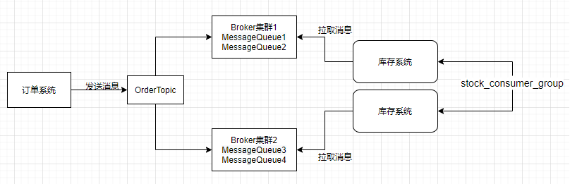 比如我们的库存系统提供了2台机器,每台机器上的消费者组名字都是stock_consumer_group,那么这2台机器就是一个消费者组。