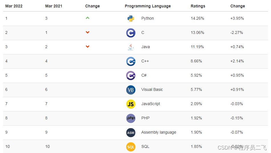 第一组呢是TIOBE指数排行,可以看到我们的Python在今年三月份排在了榜首的位置,相比去年的三月份,Python语言上升了两名,排在了C语言和Java语言前面。