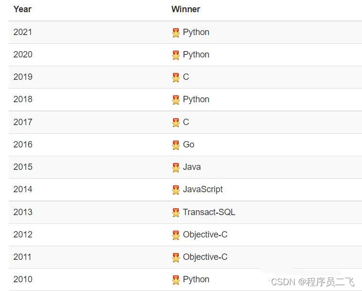 第三组数据是编程语言名人堂历年来的获奖者,获得“年度编程语言”奖项,说明该语言在那一年中有最高的收视率。而Python,在过去的2020年和2021年,连续两年成为赢家!