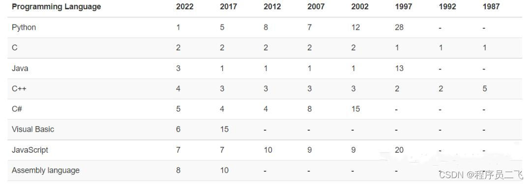 第二组数据是编程语言历年来的一个排名位置,可以清楚的看到Python在2022年,超过了C语言和Java语言,排在目前的第一位。