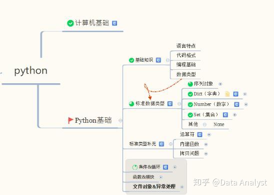 要学习如何用Python进行数据分析, CDA数据分析师建议第一步是要了解一些Python的编程基础,知道Python的数据结构,什么是向量、列表、数组、字典等等;了解Python的各种函数及模块。下图整理了这一阶段要掌握的知识点: