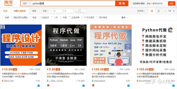 后来陆陆续续又发生了很多不开始的事情,我放弃了接单平台。在朋友的介绍下,我开始在淘宝店铺接单,淘宝店铺接单的方式也很简单,去淘宝搜索 “python接单”然后他们客服就会把你拉到他们群里,每天订单都会发到群里,技术员通过抢单的方式来接单。