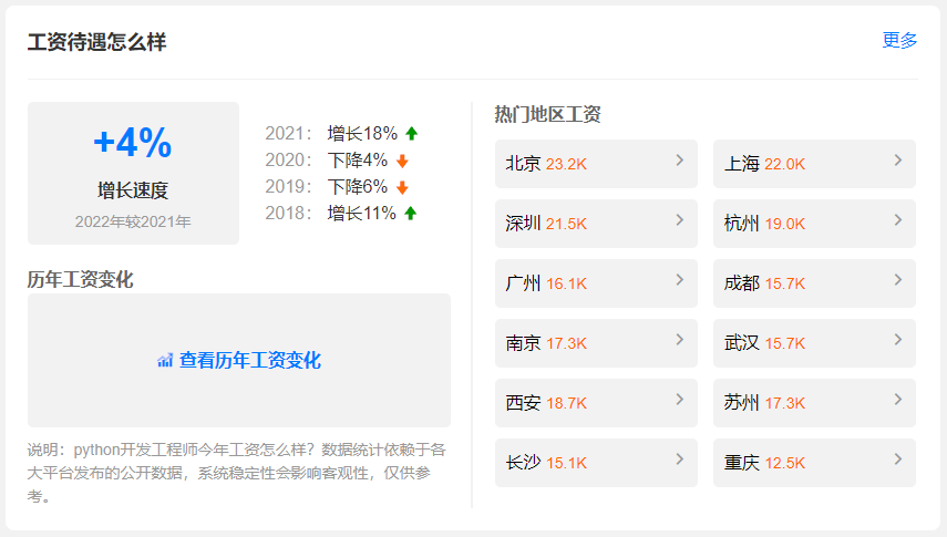 相对地,Python工程师的薪资一路上扬。2020年-20210年,Python工程师的平均薪资已经超过20000元。
