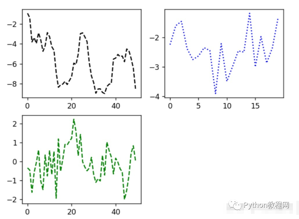 form numpy. import randnplt.plot(randn(50).csmsum(),'k--')_= ax1.hist(randn(100),bins=20,color = 'k',alpha = 0.3)ax2.scatter(np.arange(30),np.arange(30)+3*randn(30))