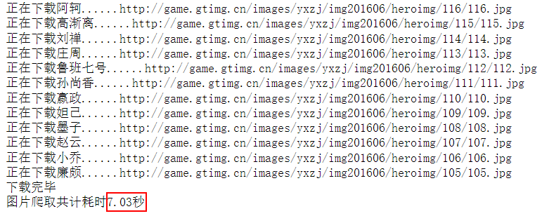 同时加一个计时器,用于计时图片爬取的时长,这里显示图片爬取共计耗时7.03秒。