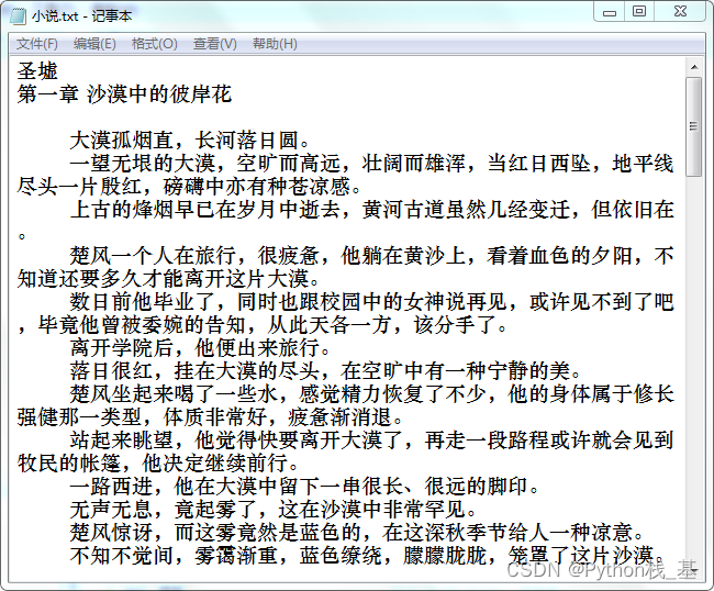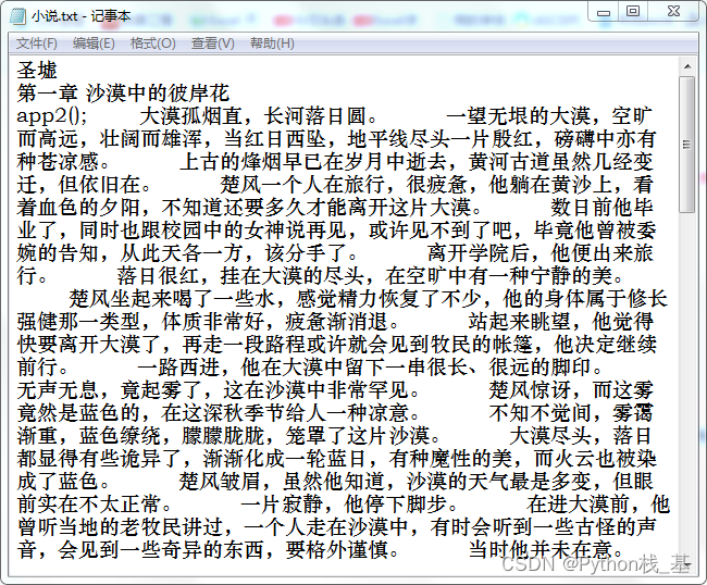 此时运行程序,就能在e盘发现已新生成了文件“小说.txt文件",打开,发现,所有想要的内容已经写入到文件里了如图3-8。但是小说内容没有换行,阅读起来不方便,且前面有个多余的app2()。