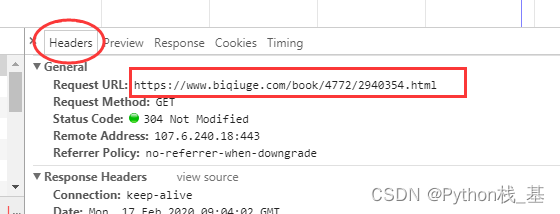 这时点击Preview左侧的Header面板,得到下图3-4中的url就是我们要找的网址。复制后,粘贴到代码里就能发出请求了。