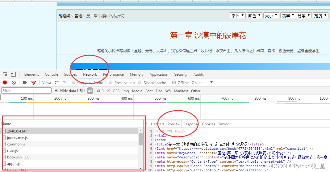 顶部菜单选择Network,中间圆圈选择Preview,通过选择左侧红色方框内的不同选项,观察Preview下部的内容,当能看到我们想要的文字时人(如图3-3),就说明找到了。