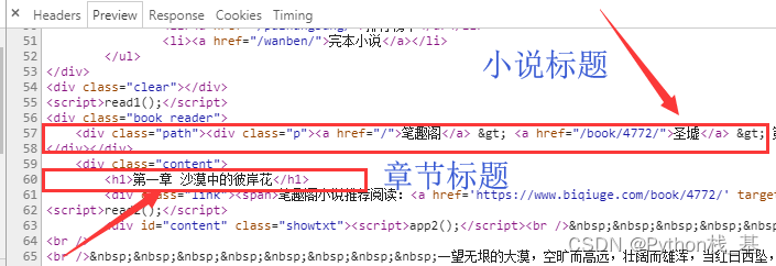 在开发者工具里,分析网页内容,发现我们的目标之一小说和章节的标题分别位于下图所示位置: