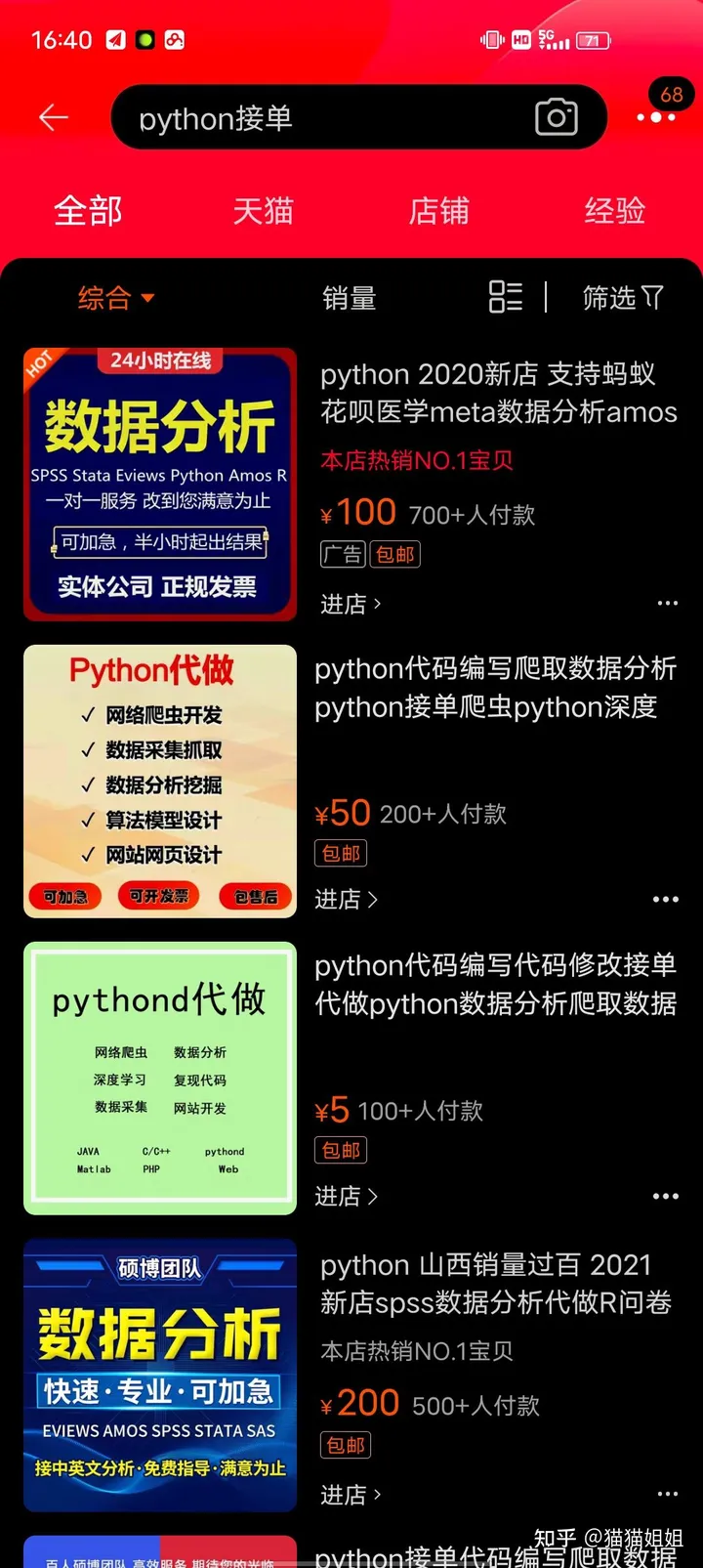做数据分析,因为淘宝有做数据分析网店,这就是我们的机会,时间自由,我们可以根据我们的时间来选择具体的项目,不过我要说一句看到感兴趣的再接,有时看到钱就很难收手要学会克制!慢慢的到后面我就加了几个群,里面可以抢爬虫的单子做,一个450的单子,到手差不多315(因为平台会抽30%)这个根据平台定30或者20不一定。