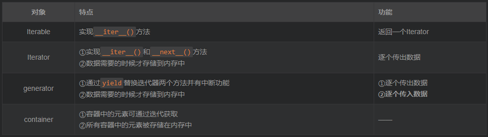 需要注意的是迭代器不会一次性把所有元素加载到内存,而是需要的时候才生成返回结果(不同于容器)。