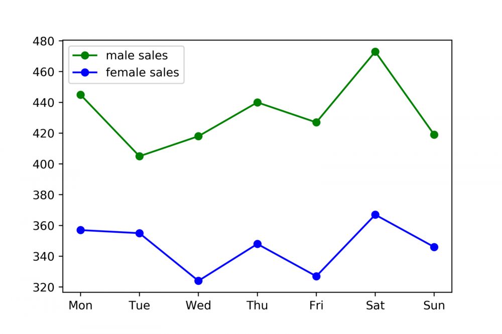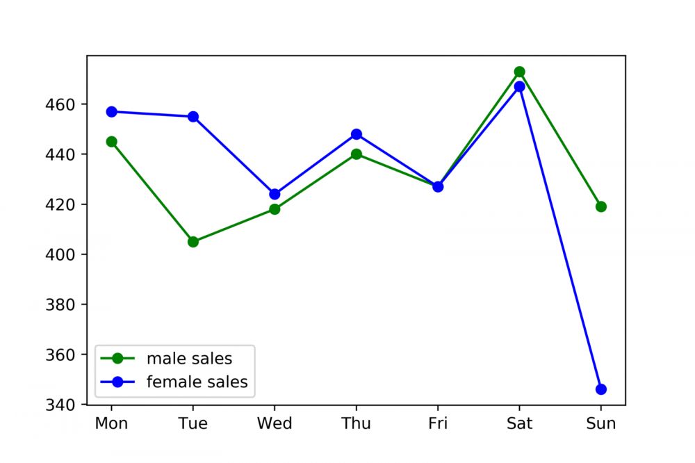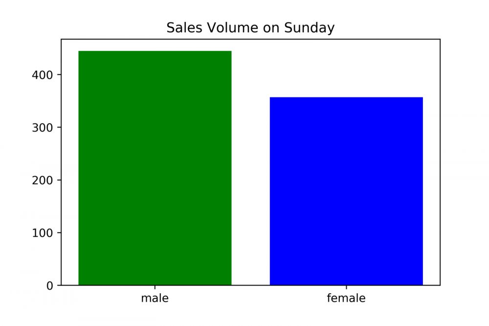 从这张图上,我们可以看到,在某个特定的周日,对于某件产品来说,男性购买了400多件,而女性购买了大约350件。
