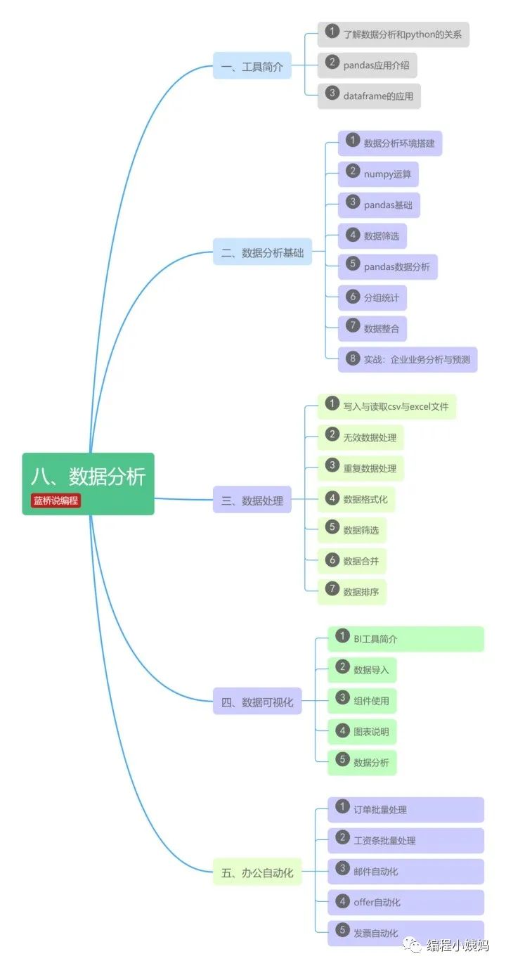 如果你是把数据分析当成一个辅助技能,那么学完下面这些就差不多,它们能满足你大多数的需求。有些小伙伴可能还是非计算机专业且从事非IT类的工作,比如说运营之类的岗位,那么我建议大家学Python入门+爬虫+数据分析就可以了,它们足以提升你在职场的工作效率,不用去全栈、测试等方向浪费时间,对你没什么大的帮助。