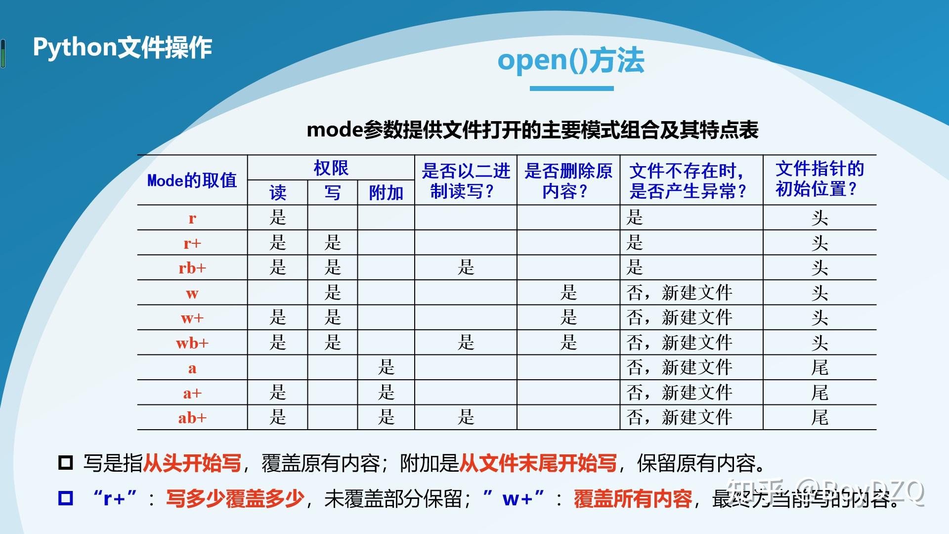 特别注意“r+”和“w+”之间的区别,二者都可以读和写。“r+”打开文件时,不会删除原有文件内容,写入时,如果原有位置有内容,则进行覆盖;而**“w+”打开文件时,会先删除原有文件内容**。