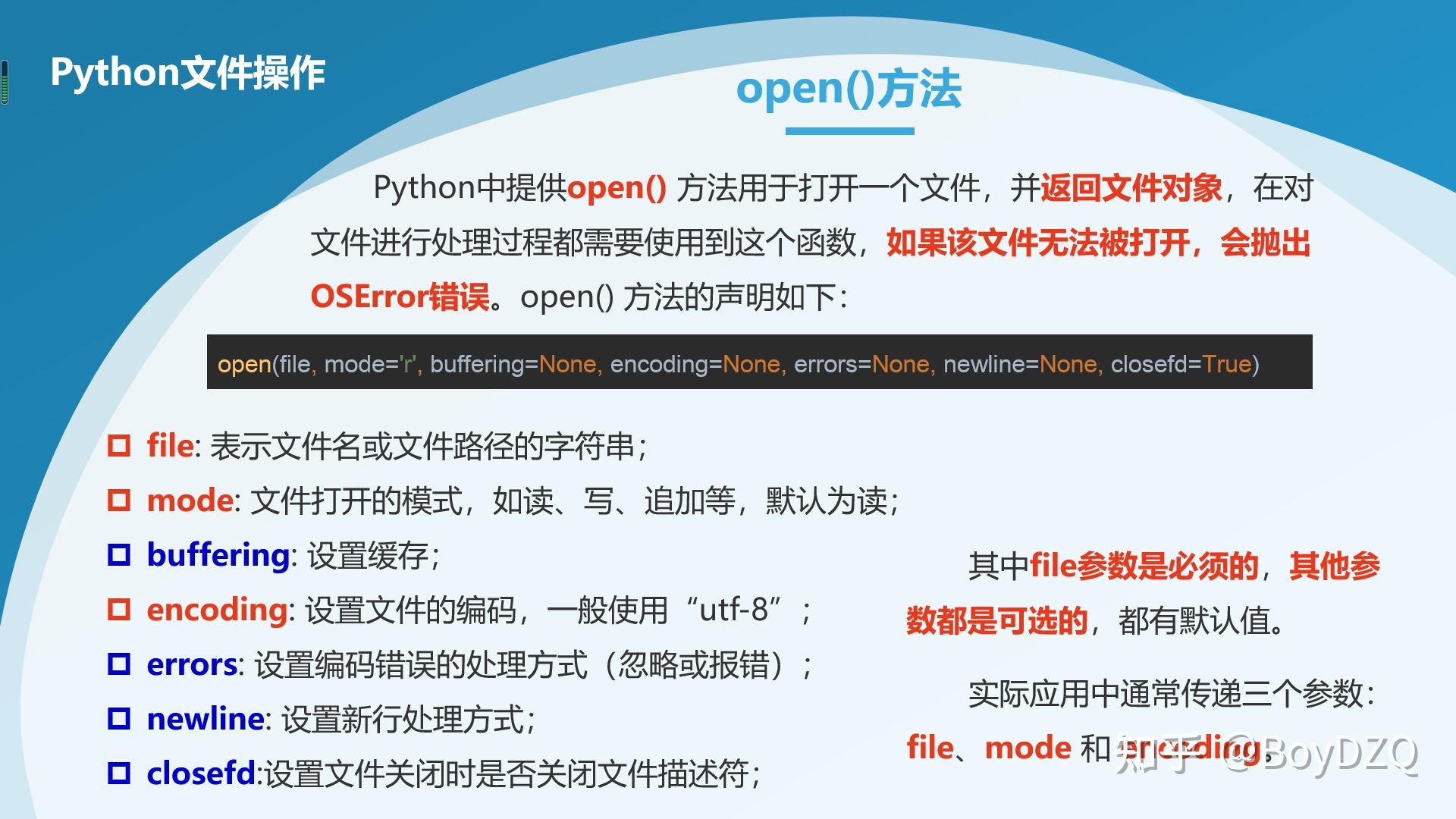Python中提供open()方法用于打开一个文件,并返回文件对象,在对文件进行处理过程都需要使用到这个函数,如果该文件无法被打开,会抛出 OSError错误。open()方法主要参数及其含义如下。