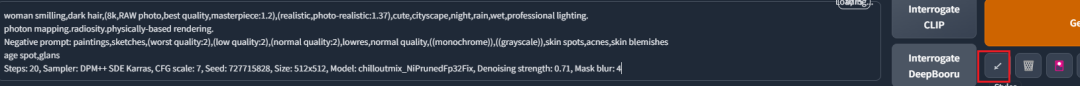 Steps: 20, Sampler: DPM++ SDE Karras, CFG scale: 7, Seed: 727715831, Size: 512x512, Model: chilloutmix_NiPrunedFp32Fix, Denoising strength: 0.71, Mask blur: 4