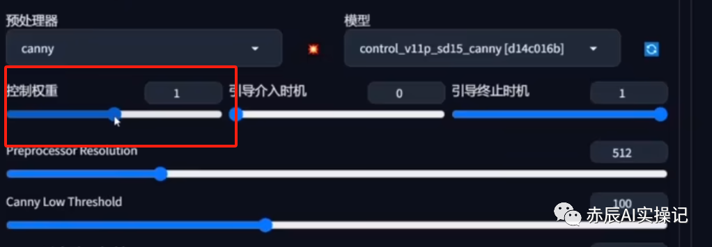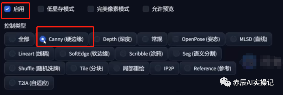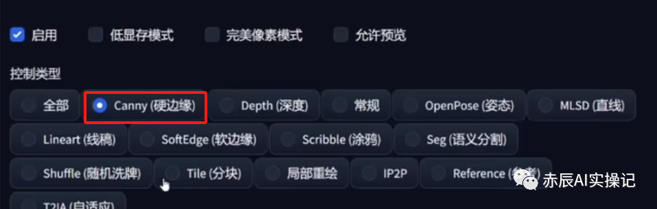 勾选启用预处理器这里也选择Cannv,模型这里也会对应的选择相应的。