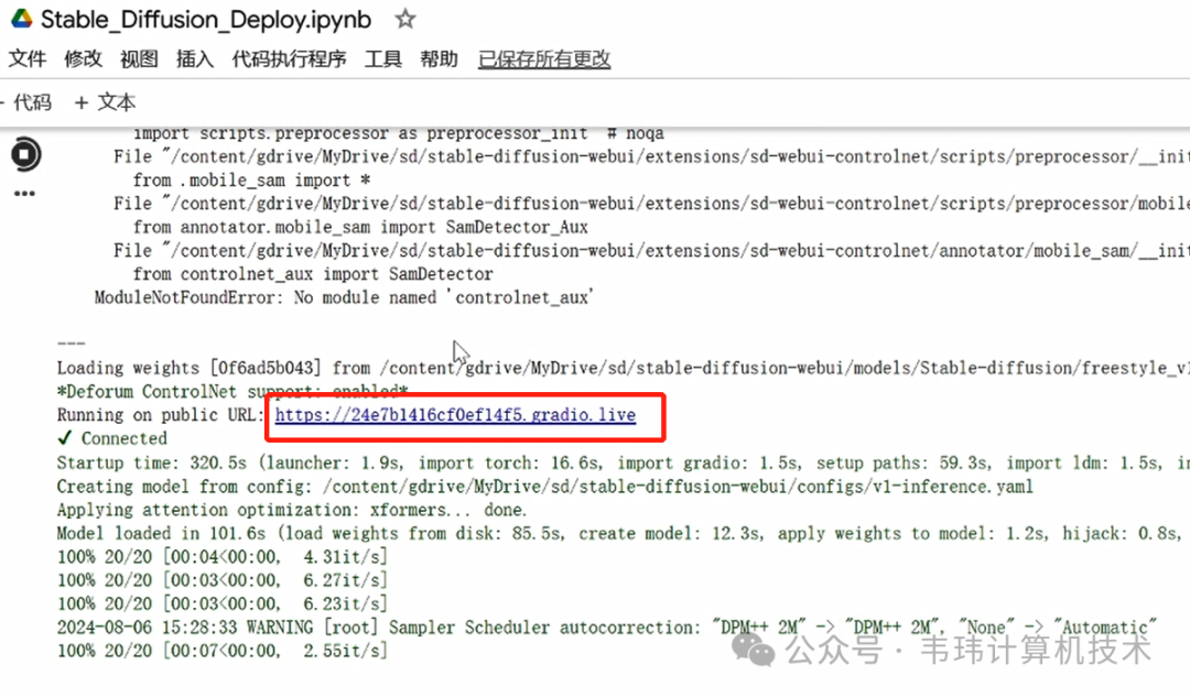先将SD启动,在这里通过云服务器启动了SD,并获取到了WEB UI的入口链接。