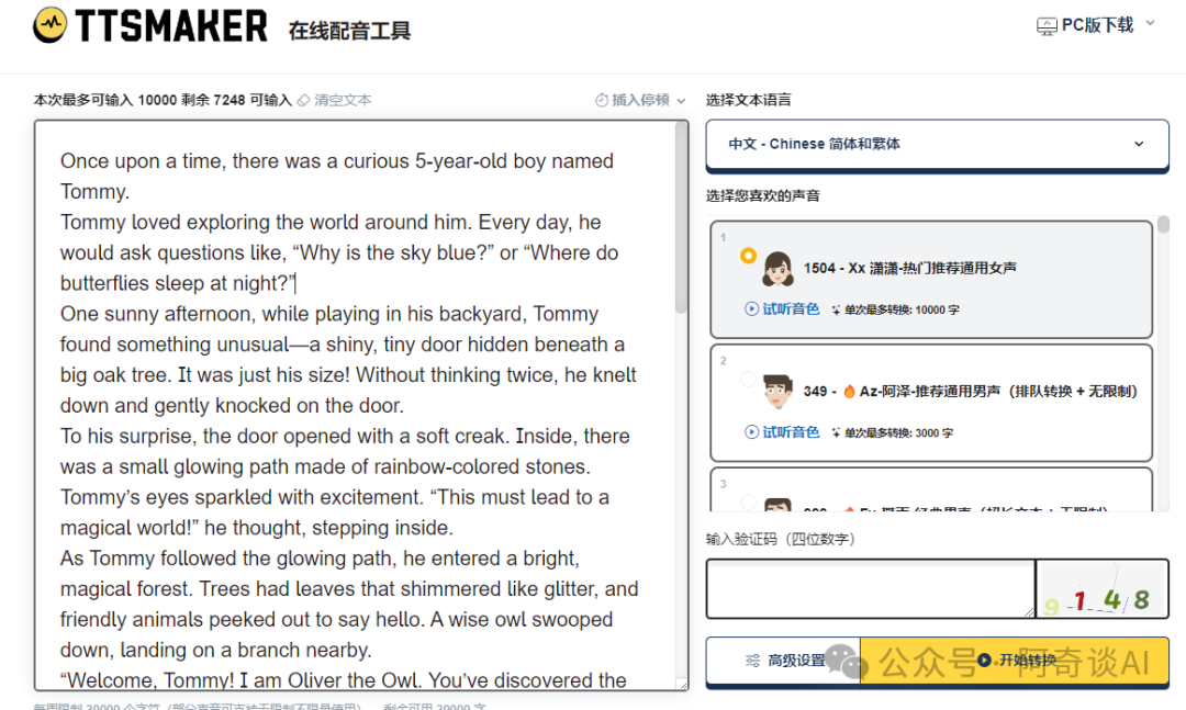 使用免费且效果好的文本生成语音工具将文案转换成音频文件并调整语速、音调等参数。比如:TTSMaker,网址:https://ttsmaker.cn/