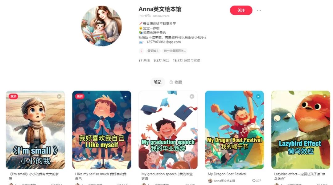 Anna英文绘本馆账号同样表现出色,拥有9.2万粉丝和15.7万点赞。