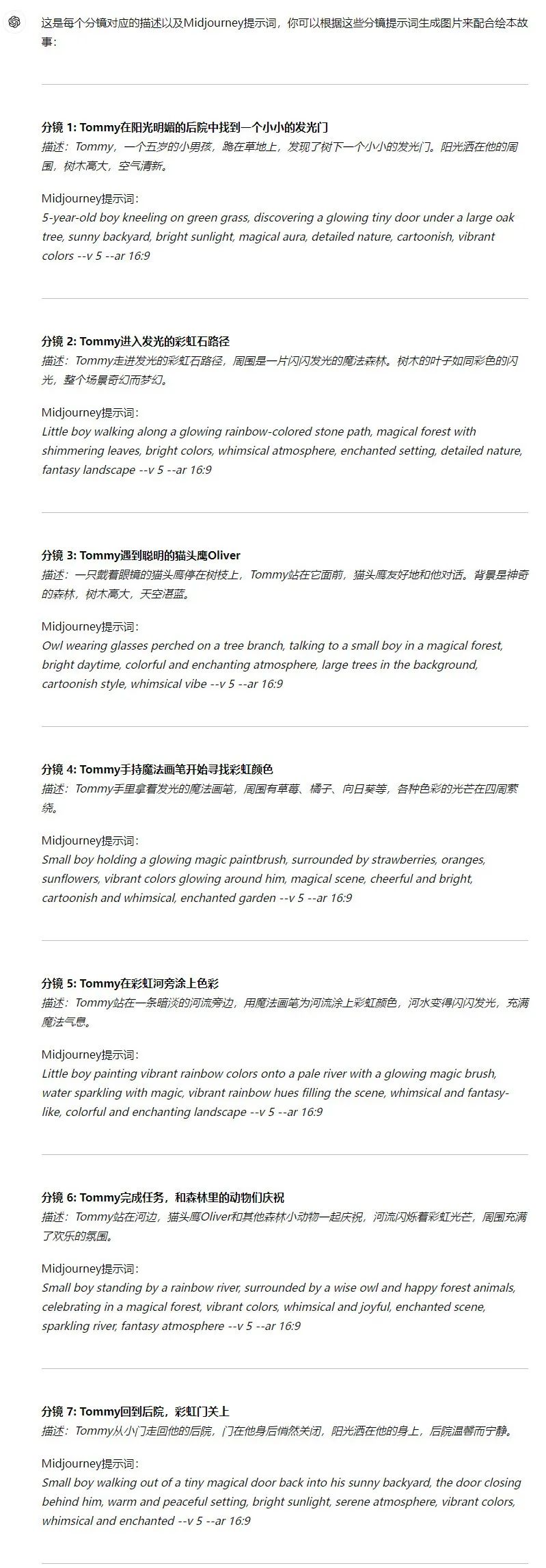 在第一步的基础上,继续让GPT生成分镜和对应的AI绘图提示词: