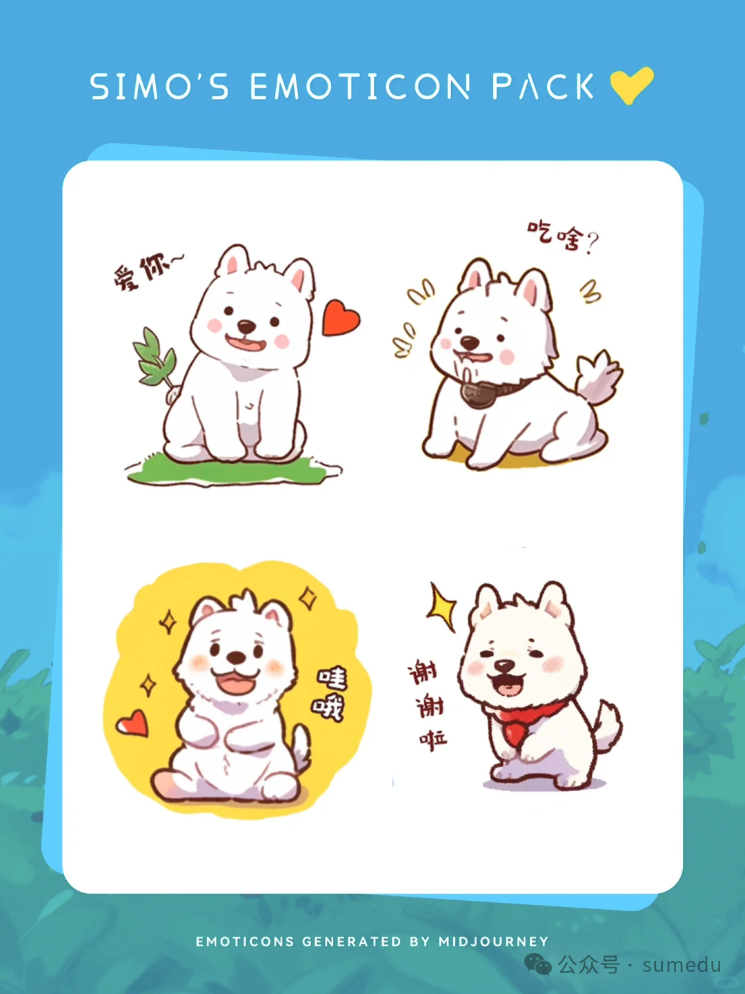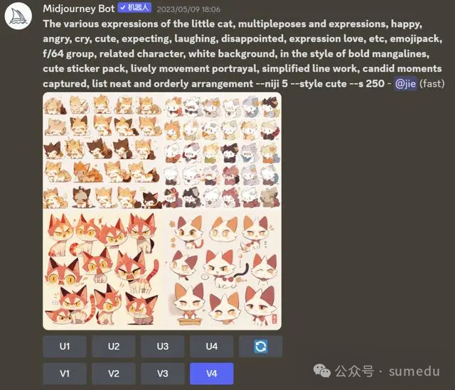 如果对第一张图满意,就点「U1」细化导出,如果喜欢第一张图但不满意,就点「V1」进行微调挑上几个觉得不错的表情,然后加上文字+抠图。
