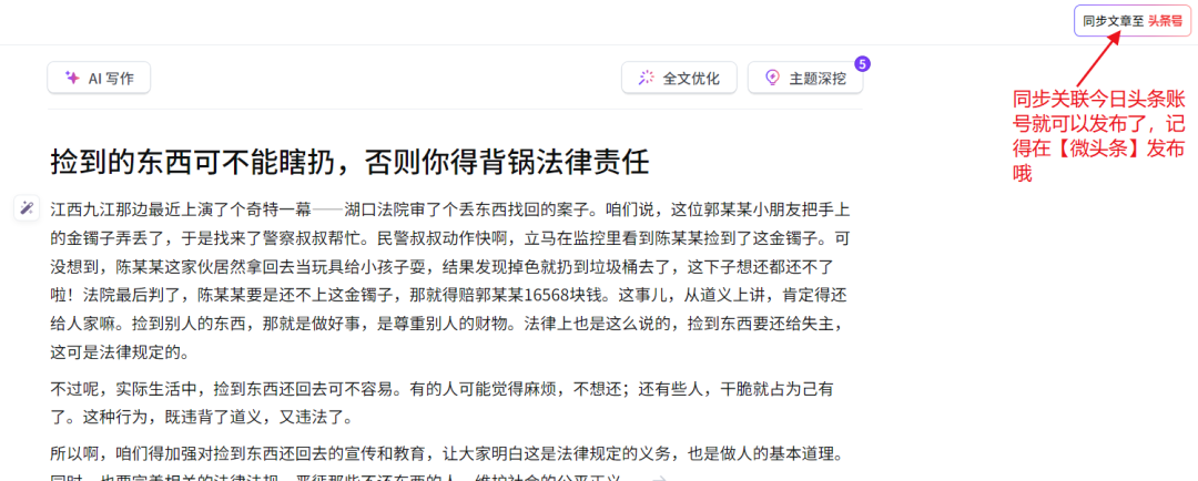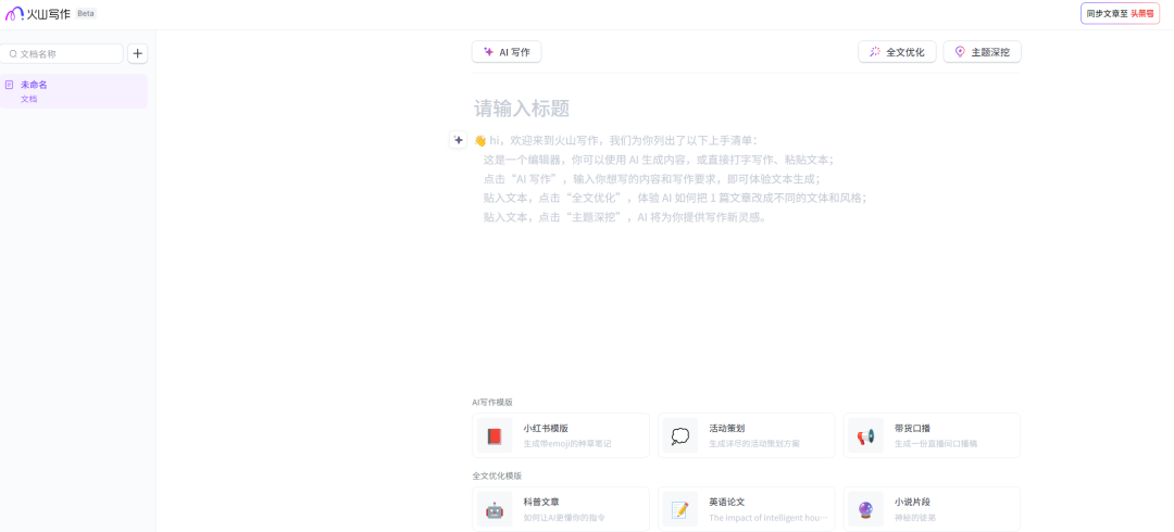 这里就给想通过写作创作变现的朋友推荐一款免费的AI写作工具【火山写作】,它是字节跳动官方出品,创作好的内容可以直接同步到【今日头条】,让大家的创作在AI的赋能下更流畅丝滑。