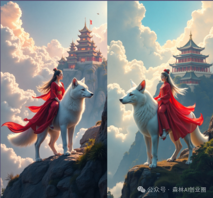 **指令分享:**Aerial view, bird’s-eye view. Fairyland Chinese mythology, the screen is full of colorful clouds, several Chinese-style palaces in clouds, sacred light, magnificent and splendid, ultra-wide-angle lens. A giant white fox stands next to the palace, with a white-haired fox fairy riding on it an oriental fairy, dressed in Chinese Han Dynasty clothing, with wide sleeves and red chiffon clothes. Ultra-detailed, ultra-high-definition, 8kar 9:16