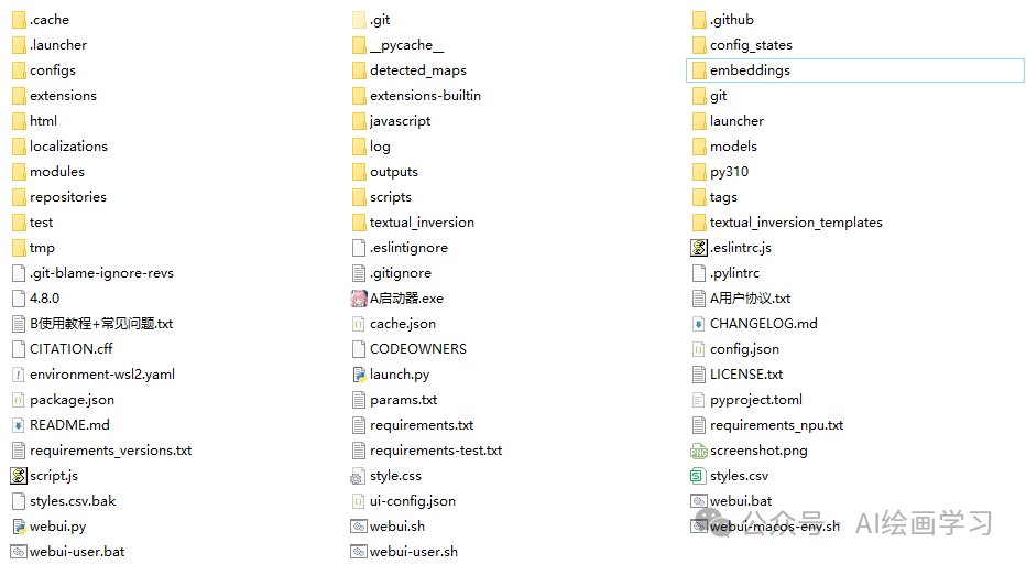 extensions:存放扩展插件的目录,我们下载的WebUI的插件就放在这个目录里,WebUI启动时会自动读取插件,插件目录都是git库,可以直接通过git更新;