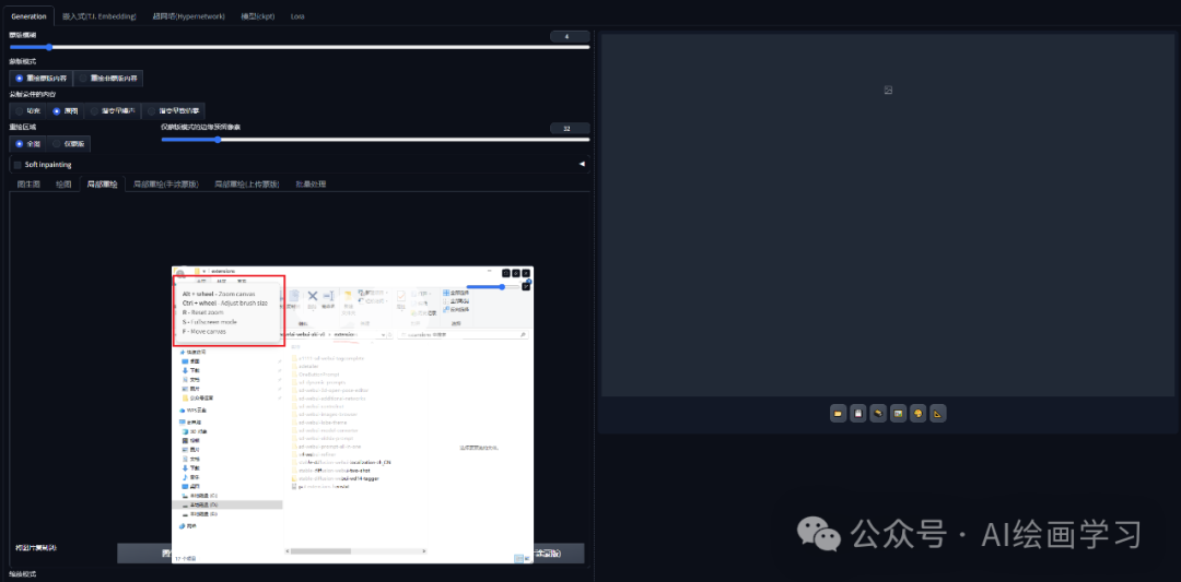 这个扩展允许用户在图形界面上缩放和平移图像。可以在使用局部重绘、涂鸦重绘等功能时快捷的缩放图片大小,方便对图片区域进行精准的绘制.