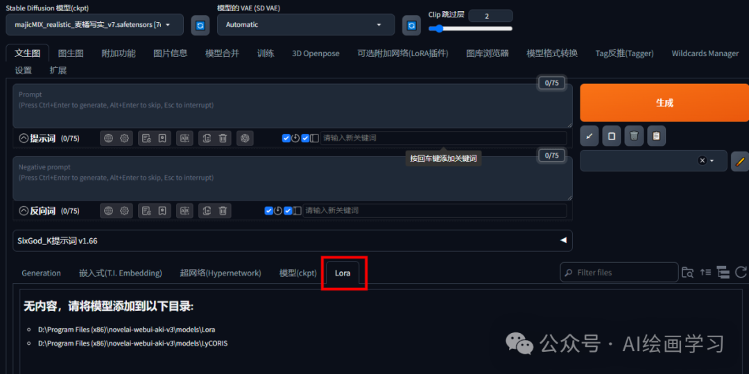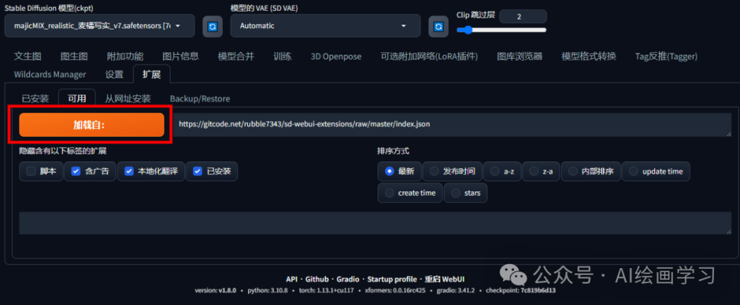 Low-Rank Adaptation of Large Language Models 低秩的适应大语言模型,上一篇咱们详细讲过,这里指已自带安装了这个插件,你可以下载很多lora模型,来使用。