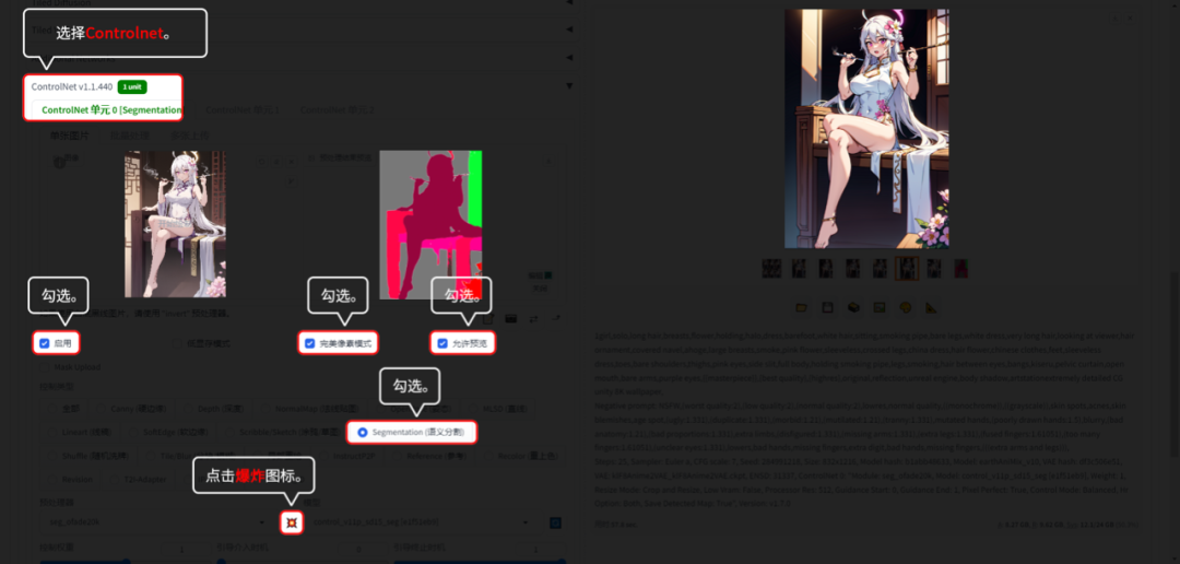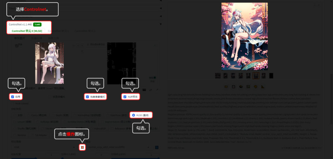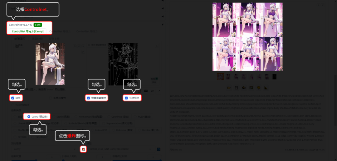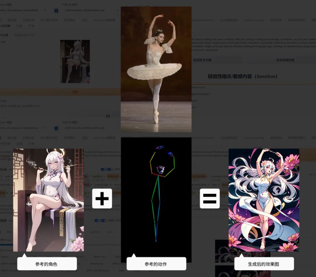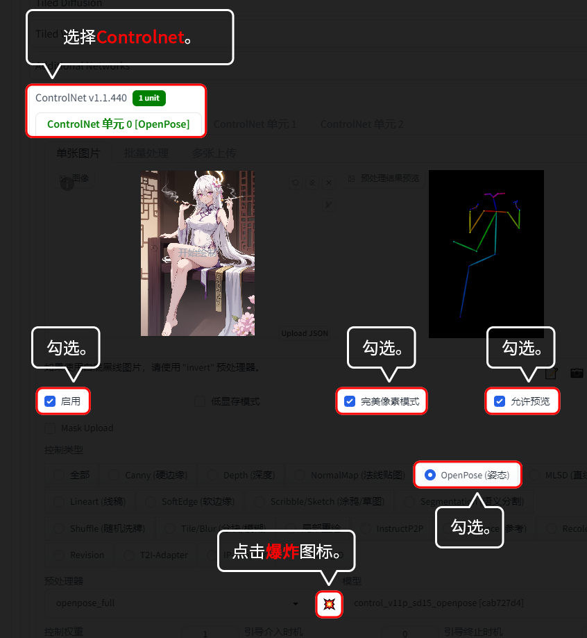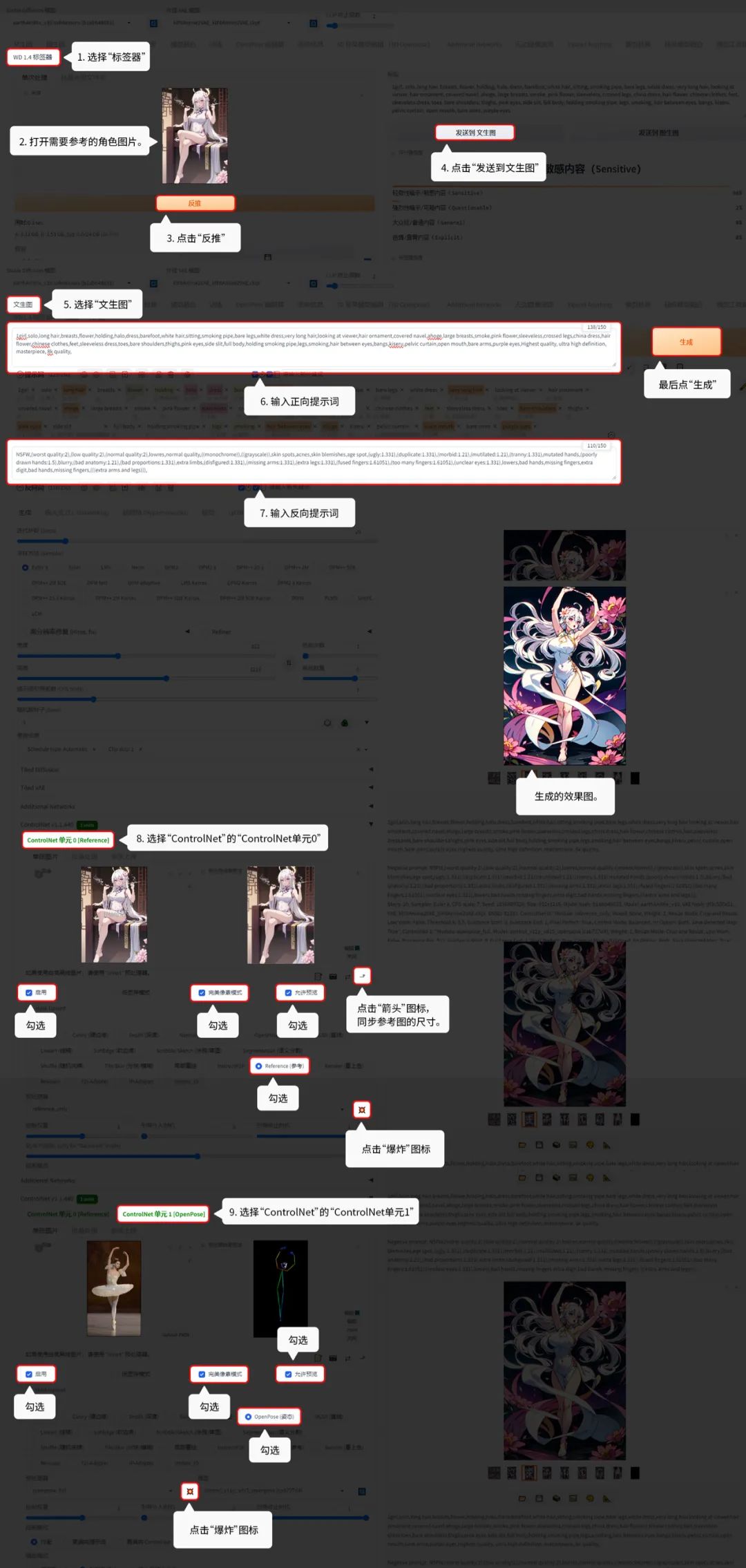 操作要点:在ControlNet里的ControlNet Unit 0里放入要参考的角色,控制类型选 Reference (参考) ,记得点爆炸图标。在ControlNet Unit 1里放入要参考的动态,控制类型选 Openpose(姿态) ,记得点爆炸图标 。