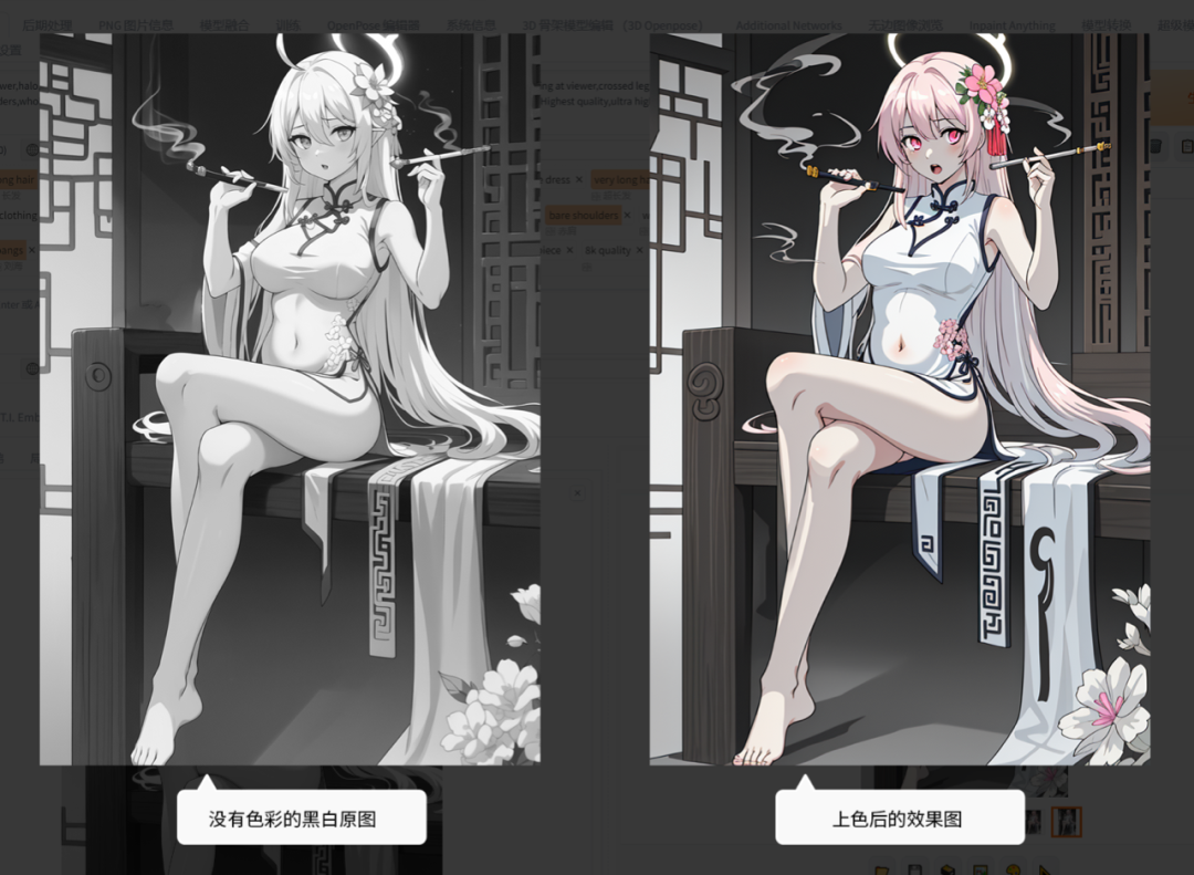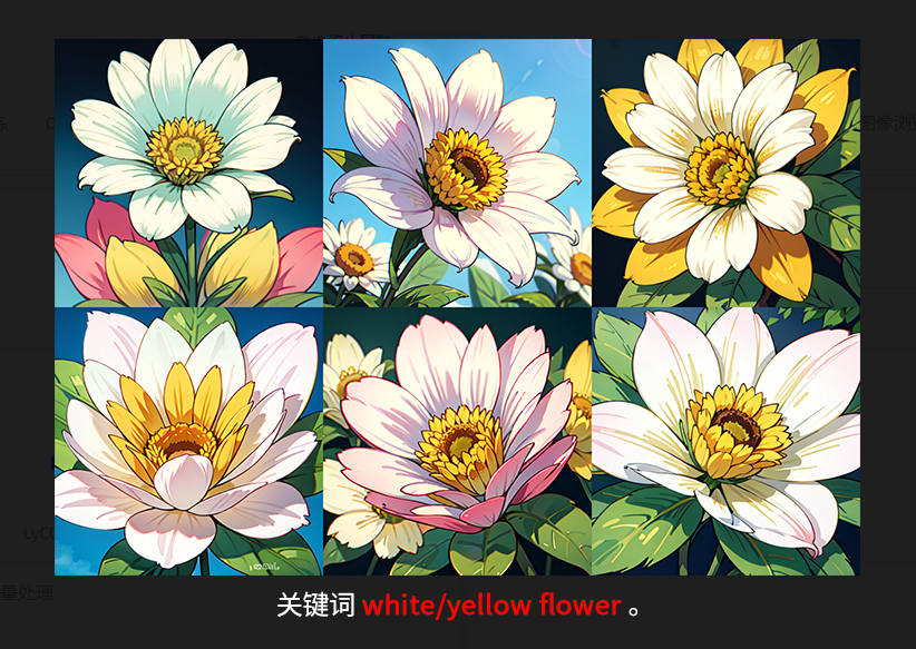 例2: (white flower:0.8),含义:调节百花(white flower)的权重为原来的0.8倍(减弱)。