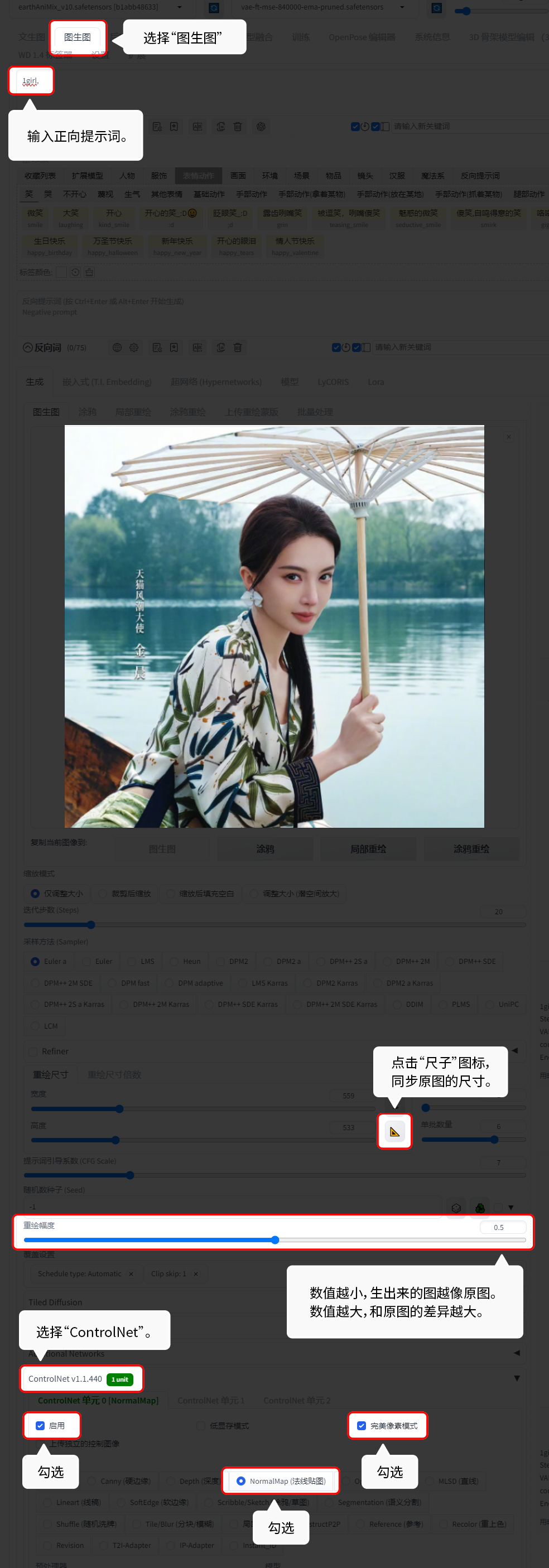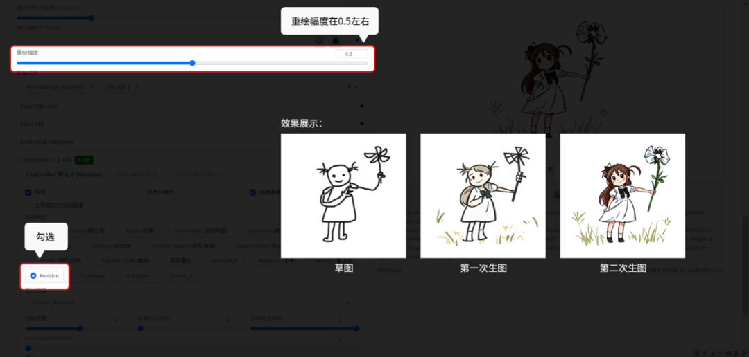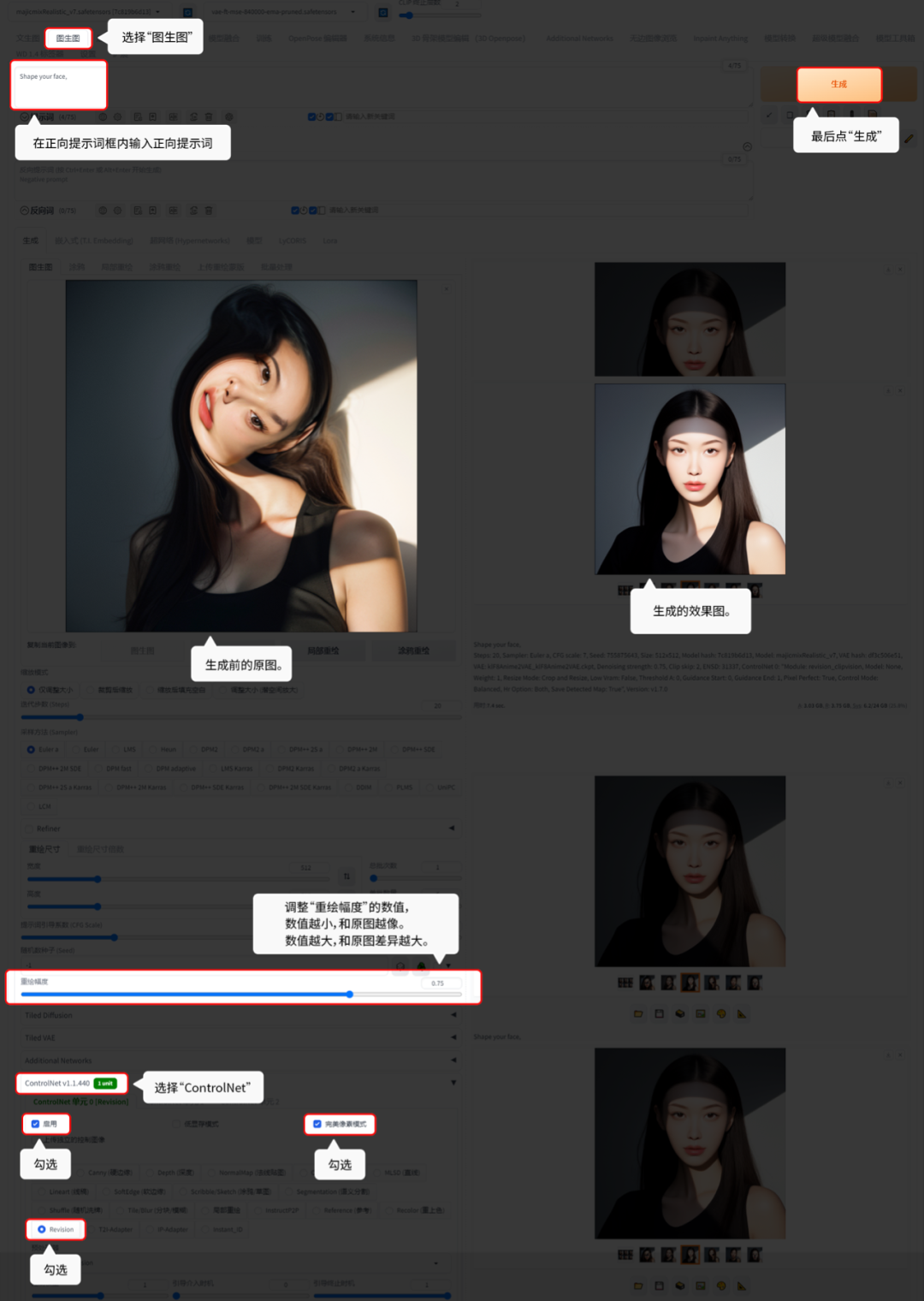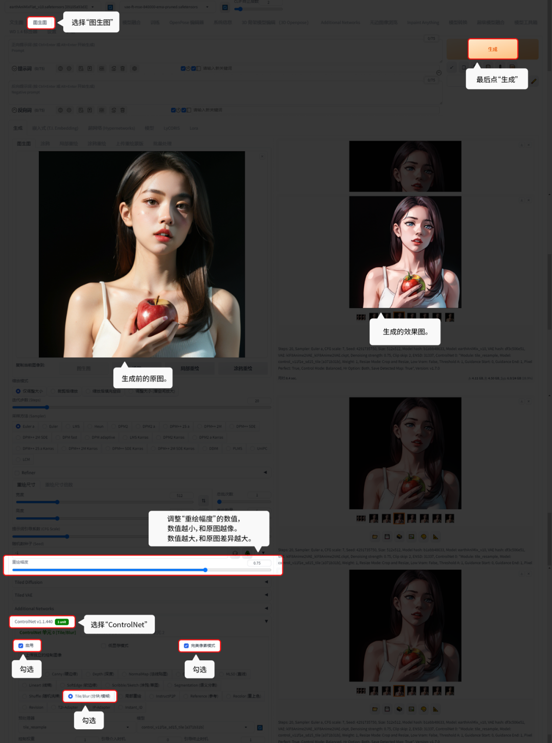 重绘幅度:重绘幅度数值越大,生出来的图就和原图的差异越大,数值越小和原图差异越小。