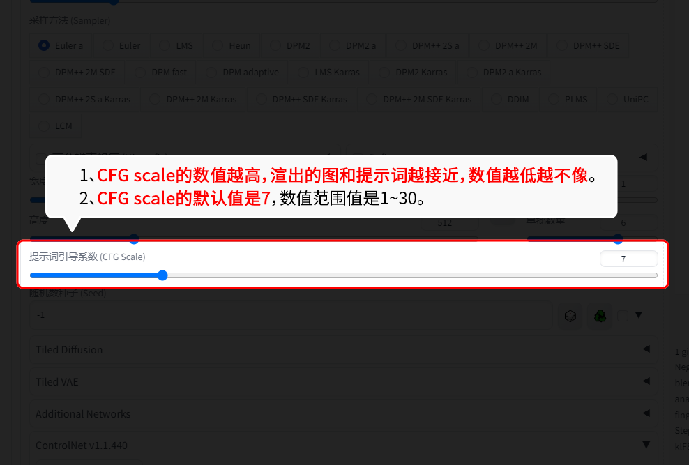 2、 CFG scale的默认值是7,数值范围值是1~30。