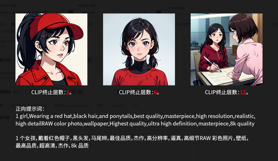 CLIP****终止层次越小,渲出的图越接近我们的提示词。数值越大越不像。