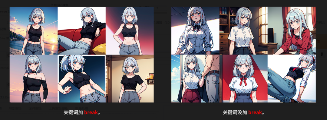在词与词之间,用“ break ”隔开,如:在银色头发、黑上衣、灰背带裤的女孩的关键词1girl,Silver hair break Black blouses break Gray pants中加入“ break ”,这样可以提高关键词的准确率。