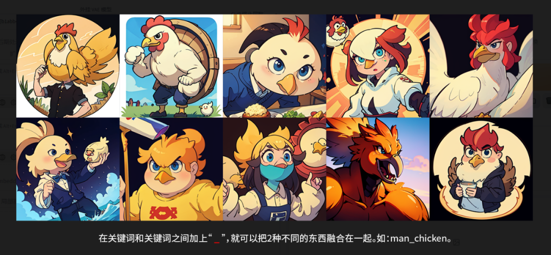 在关键词和关键词之间加上“ _ ”,就可以把2种不同的东西融合在一起。如:man_chicken。