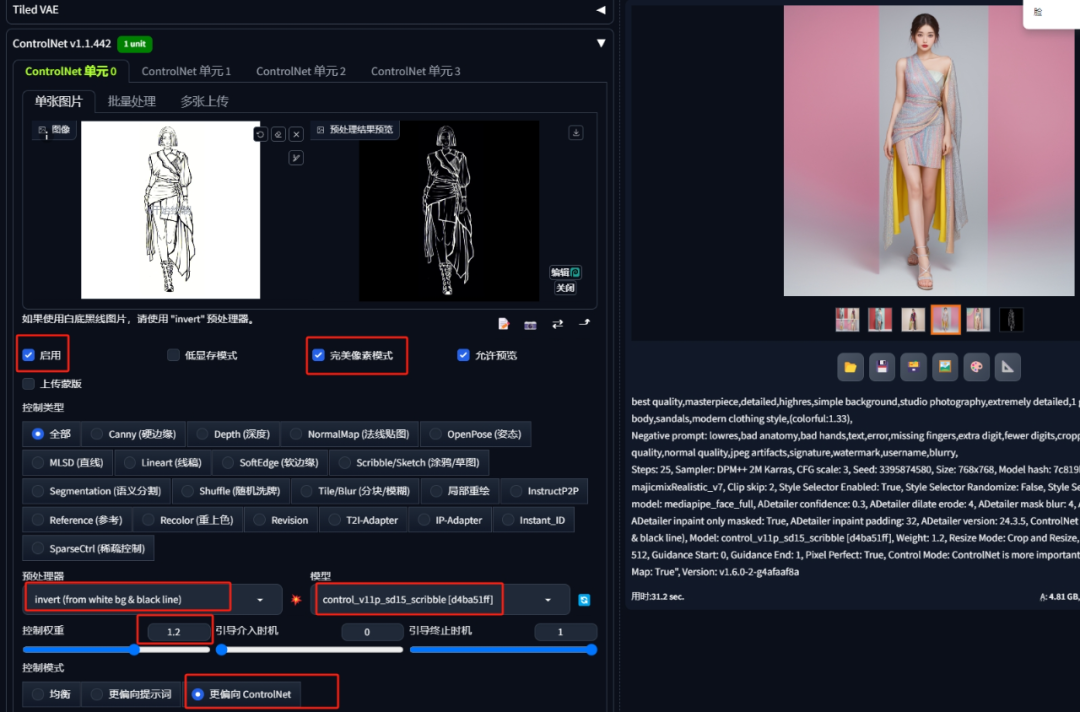控制权重适当调高为1.2,控制模式选【更偏向ControlNet】,这样出图更接近线稿图。