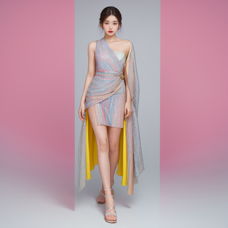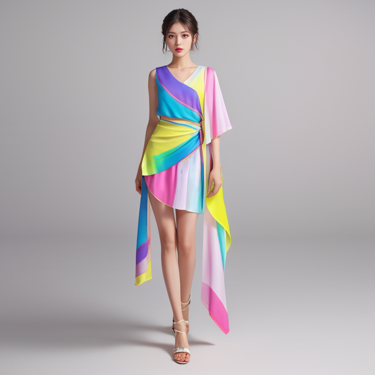 best quality,masterpiece,detailed,highres,``simple background,studio photography,extremely detailed,``1 girl,updo,standing,full body,sandals,modern clothing style,(colorful:1.33),