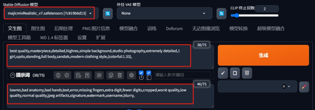 大模型选SDXL基础模型,由于SDXL超强的自然语言理解,提示词可以是一个句子,负面提示词留空即可,也可以填写一些通用负面提示词,效果更好。