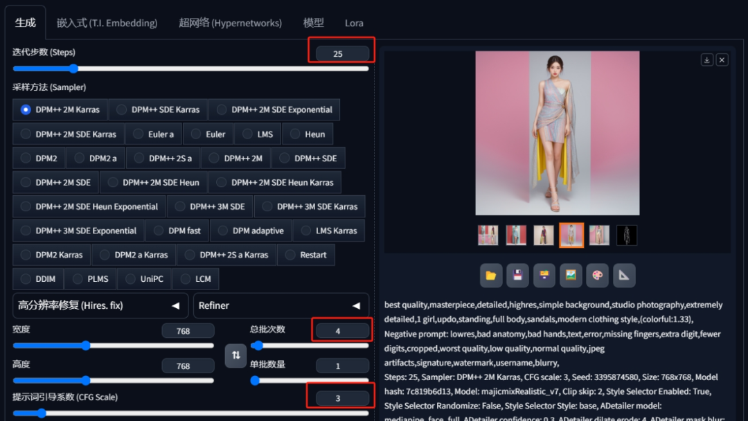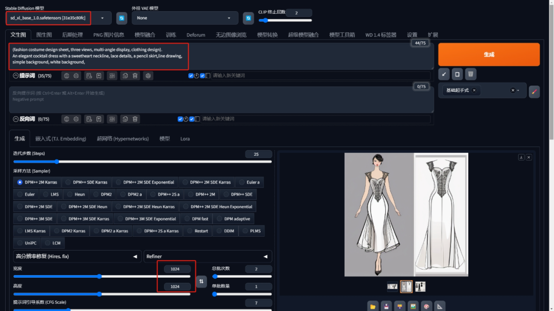 迭代步数25,宽高768*768,提示词引导系数为3-5之间,太高的话图片容易跑偏,跟线稿图不像。